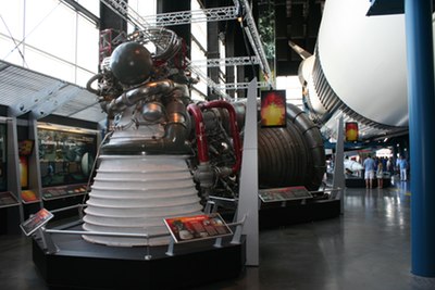 The original museum building is still tired (more on that in a moment), but walking into the Davidson Center a little over a week ago I was surprised and impressed, very impressed. The cracks in the floor were still there, but I did not see, and wasn’t looking for, more evidence of construction problems; maybe the roof leaks and I just don’t know it. But the center itself is great. The museum has done an excellent job of telling a story and educating the public, and not dumbing everything down to the lowest common denominator. Huntsville, of course, is the home of NASA’s Marshall Space Flight Center, which designed and tested much of the Saturn V, and the Davidson Center focuses on that aspect of the Apollo program. The center includes an Apollo Command Module and a mockup Lunar Module. But most of the displays in the cavernous hall are devoted to the rocket’s engines and their testing, as well as the Instrument Control Unit that guided the rocket in flight, in other words all the work that was performed just a few kilometers away at Marshall.