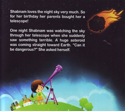 The story starts when a little girl named Shabnam is stargazing with her telescope one evening and spots an asteroid heading toward Earth. She tells her friends, including Hansen, a “Dianasour fan,” (apparently a translation error, and nothing to do with the British monarchy) who informs her that an asteroid killed all the dinosaurs.