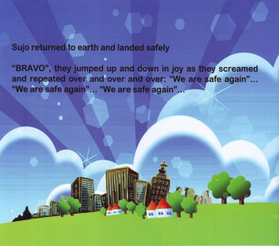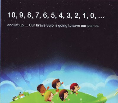 Sujo, who looks a lot like a young Harry Potter, wins at Rock-Paper-Scissors, puts on a spacesuit, and flies into space. After reaching the asteroid, “Sujo installed the rocket and fasten the belt around asteroid tightly. It was a difficult mission, but he came over.” (Probably a translation problem there.)