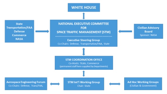 The organizational chart above is only notional, and we expect it to be later refined. Although the STM ExCom would be the overall supervisory body, the STM Coordination Office would organize the actors, coordinate the action, carry out everyday work, and house permanent staff provided by the relevant federal agencies.
