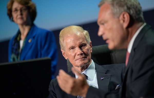 ![]() Nelson looks on as Walther Pelzer, head of the German space agency DLR, speaks during the Space Symposium panel. (credit: NASA/Bill Ingalls) |