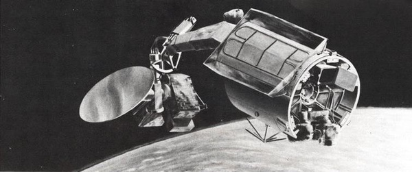 ![]() Artist impression of the experimental P-72-2 satellite which carried several sensors to detect infrared targets. One was a scanning sensor (like DSP's infrared sensor) and another was a mosaic sensor. The sensors faced downward. The disk at left and the pan on top of the satellite were radiators. The satellite was launched in 1975 but failed to reach orbit. (credit: USAF) |