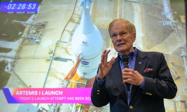 ![]() NASA administrator Bill Nelson delivers the bad news about the launch scrub September 3 to VIPs at the Kennedy Space Center. He defended the design choices behind the rocket, noting that “space is hard.” (credit: NASA/Bill Ingalls) |