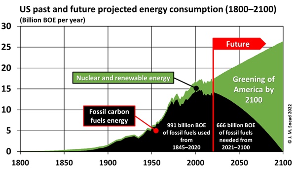 Reasonable people understand and accept that fossil carbon fuels are not sustainable. Hence, America’s need to transition away from these fuels is inevitable. For the purpose of this discussion, a target planning year to fully complete the transition is set for 2100. (Why 2100? This will become clearer later as the magnitude of the needed replacement green energy infrastructure is estimated.) Since we cannot simply just stop using fossil carbon fuels without collapsing our industrial culture, a reasonable starting question to ask is: From 2021 to 2100, how much more fossil carbon fuels will America still need?