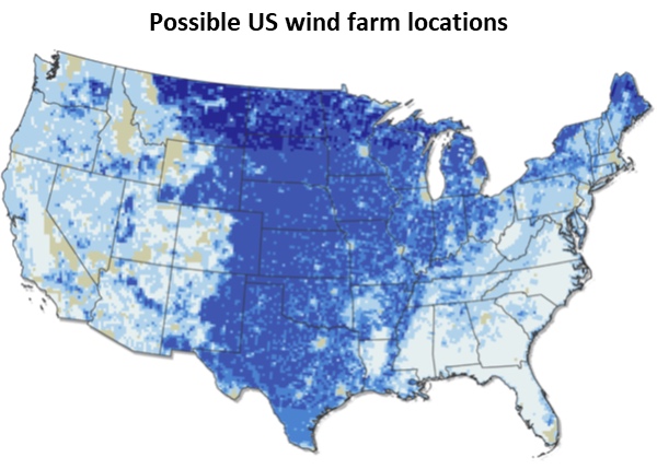 ![]() Figure 6: Possible wind farm locations. The color code of each 20 km by 20 km square indicates the wind-generated energy potential when using 1.6-MW wind turbines. The darker the blue color the greater the potential to generate energy in an average year. For this map, the gross capacity factor must be 35 percent or greater. (Image source: US Government.) |