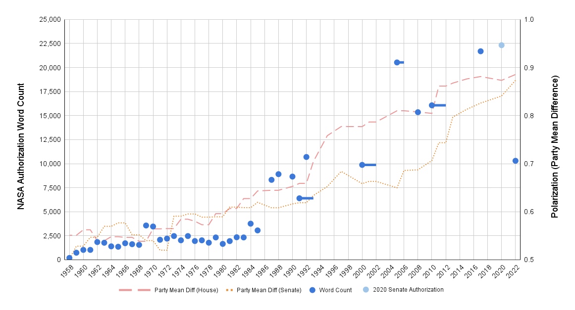 ![]() Chart 1. NASA Authorization legislation has, on average, grown in length and decreased in frequency beginning in the mid-1980s, consistent with the increasing polarization of Congress. Lines denote the duration of multi-year authorizations. The outlier in 2022 was the likely result of the NASA authorization’s inclusion within the CHIPS and Science Act. We present the 2020 NASA Authorization, which passed the Senate but not the House, as context. Note how legislative word count grows similarly with congressional polarization, as measured by UCLA’s DW-NOMINATE index. |