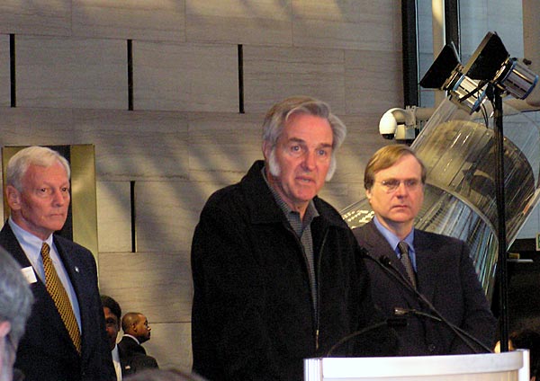 Burt Rutan speaks at the dedication ceremony, with National Air and Space Museum director Jack Dailey (left) and Paul Allen. (credit: J. Foust)